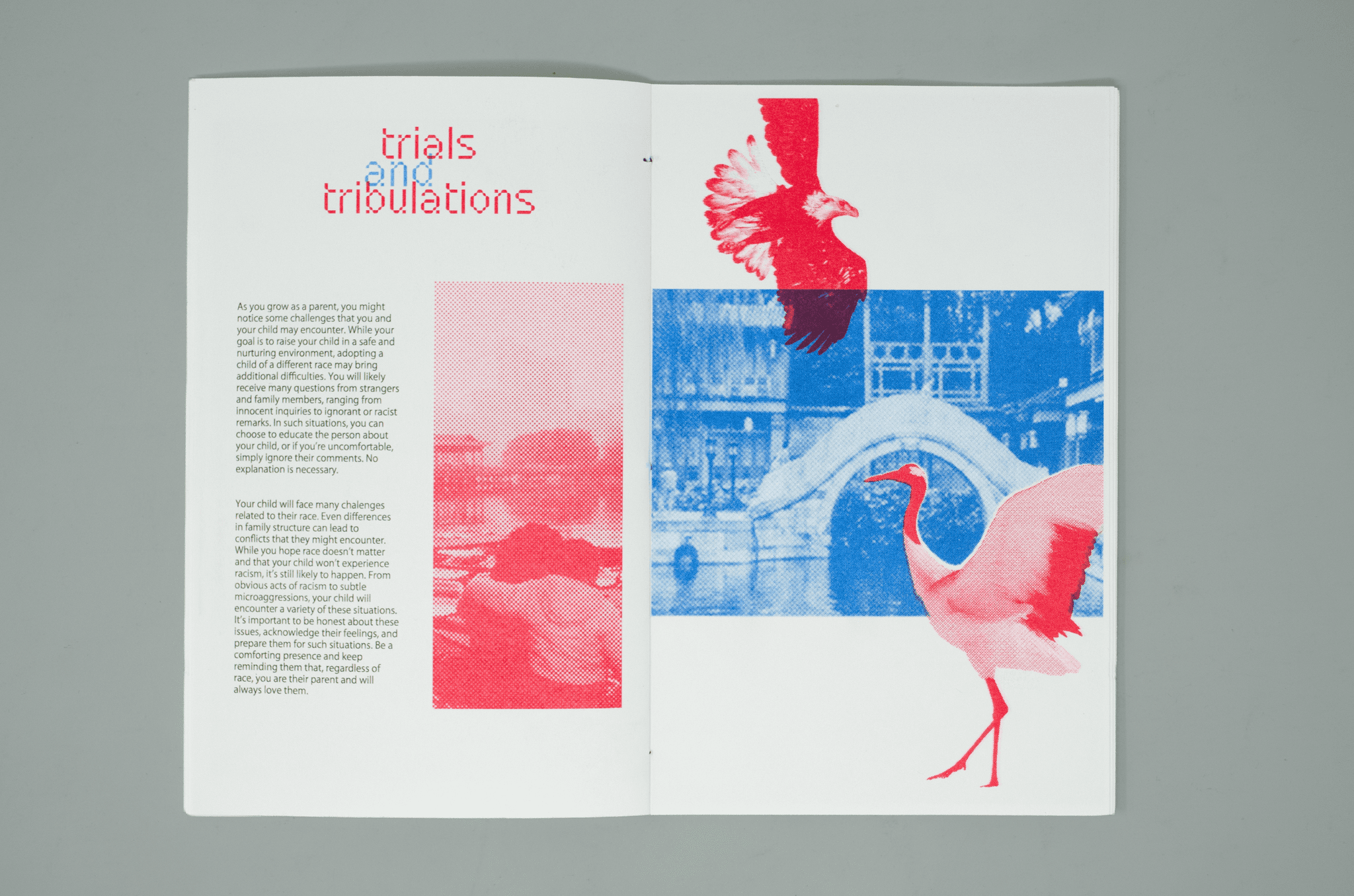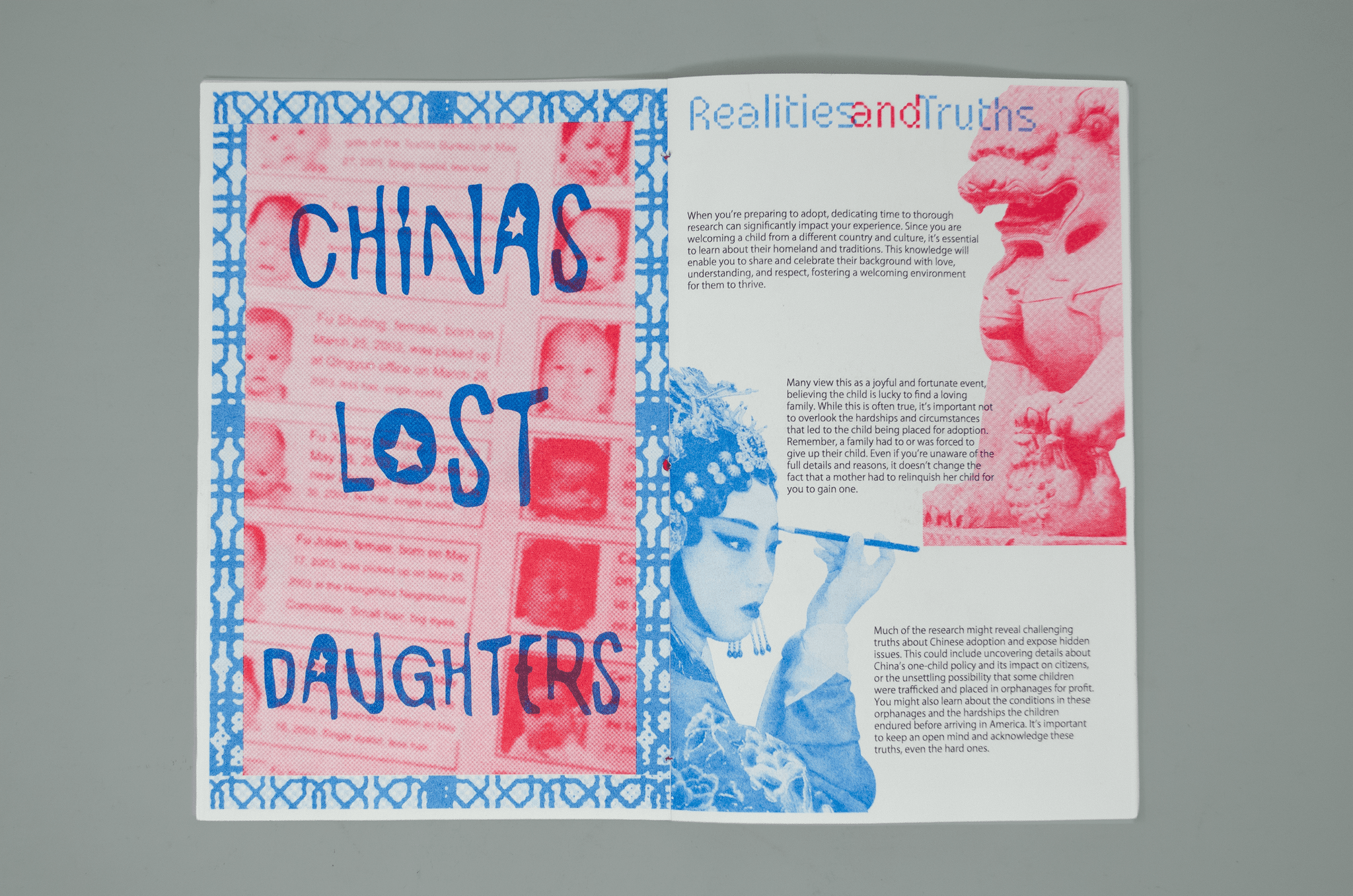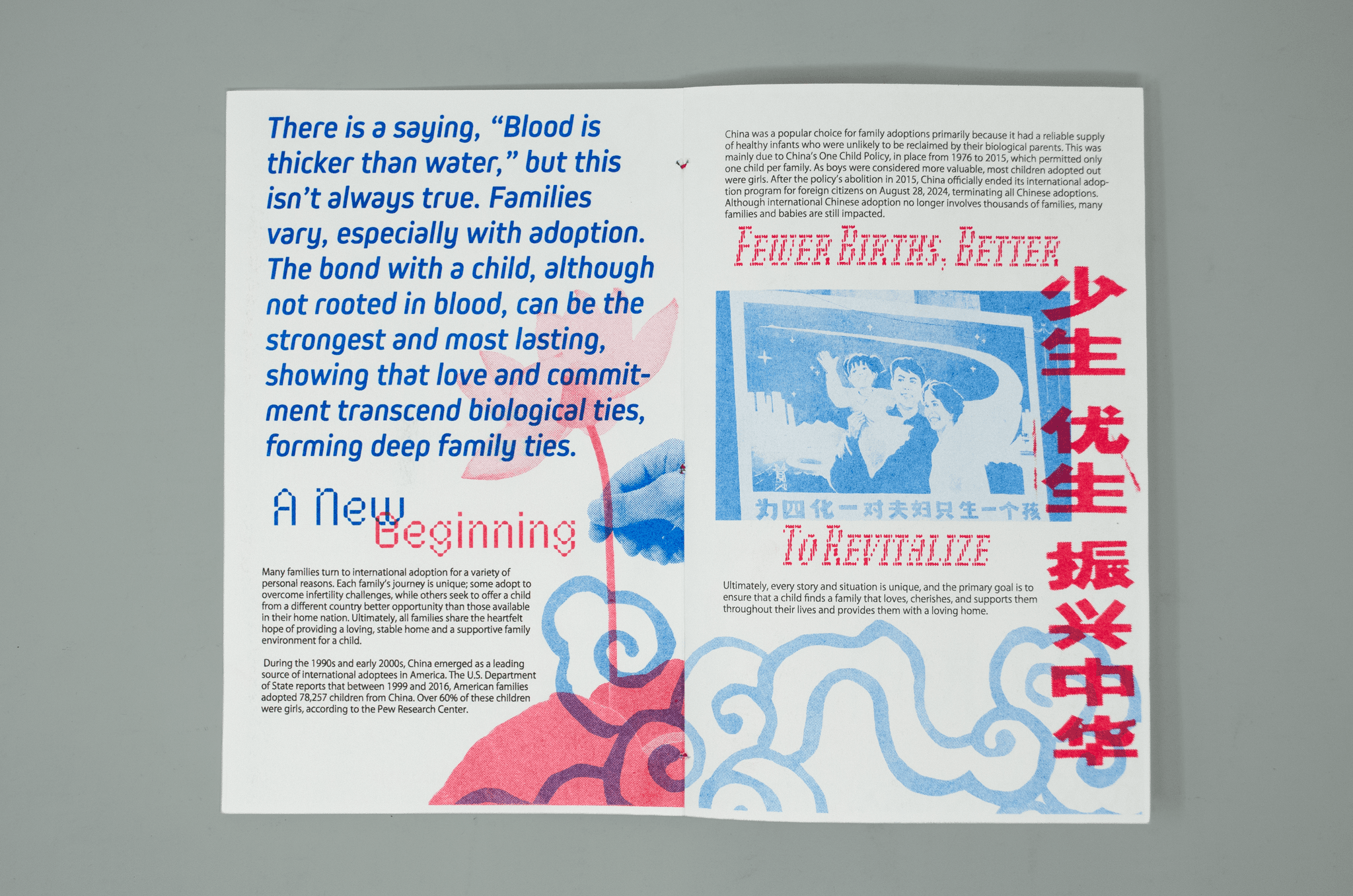 For my thesis, I chose to develop a Chinese adoption zine with Riso that highlights the challenges faced by both parents and adoptees on their journey together as a family.Having been part of the adoption journey myself, I saw this as a meaningful way to share both my story and my parents’ story about adopting my sister and me. I hope this zine resonates with both adoptees and their parents, allowing them to read and connect.